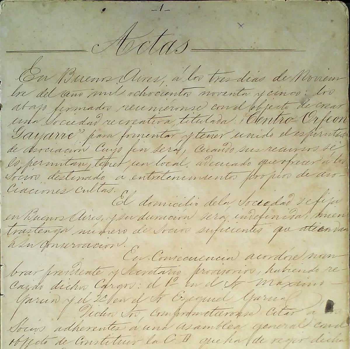 La fundación del centro data del año 1895, cuando se llamó “Centro Orfeón Gayarre” en homenaje al tenor nacido en Navarra, Julián Gayarre, quien había fallecido recientemente en el año 1890 causando una gran conmoción en toda España y en el mundo de la lírica. Recién en 1897 adopta el nombre definitivo de Centro Navarro con el que continúa hasta la actualidad.