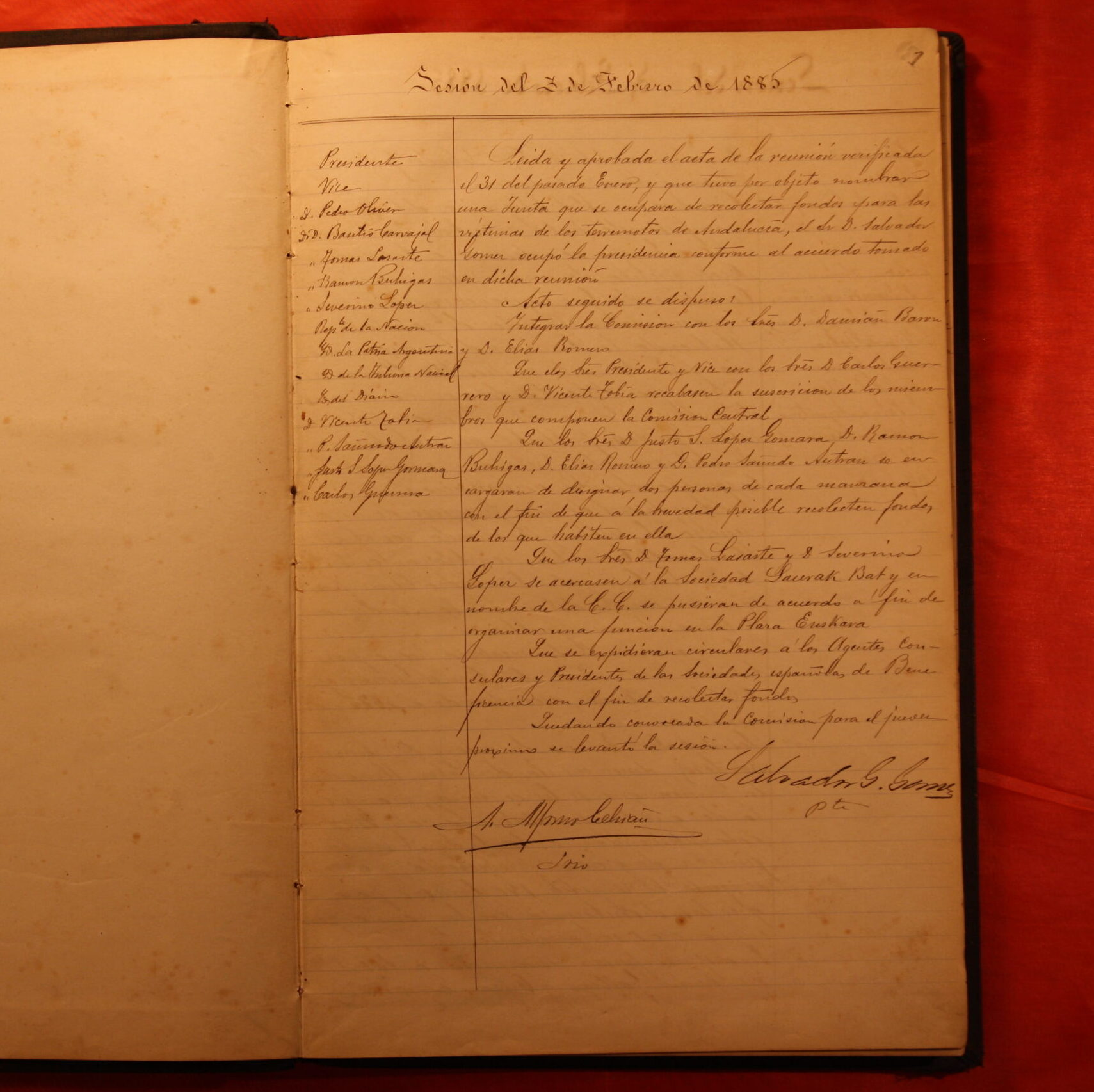Libro de la Comisión de Auxilio a las víctimas del terremoto de Andalucía. Año 1885. Meses de febrero a junio.